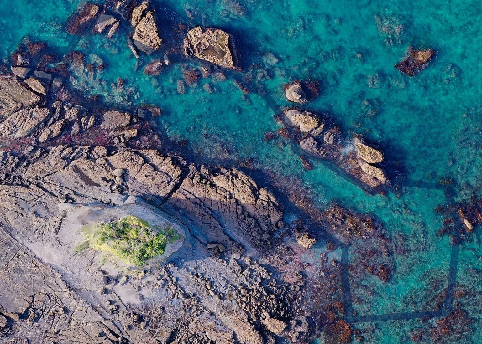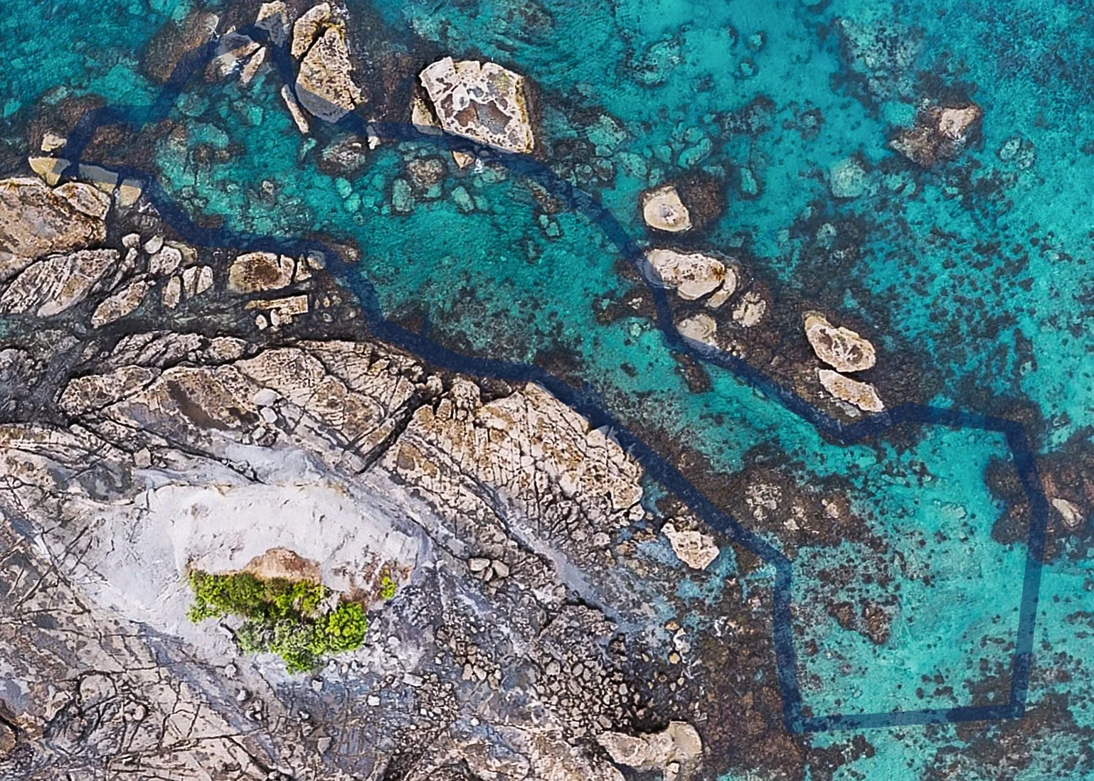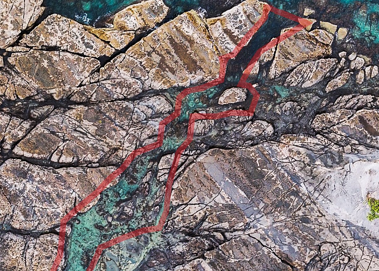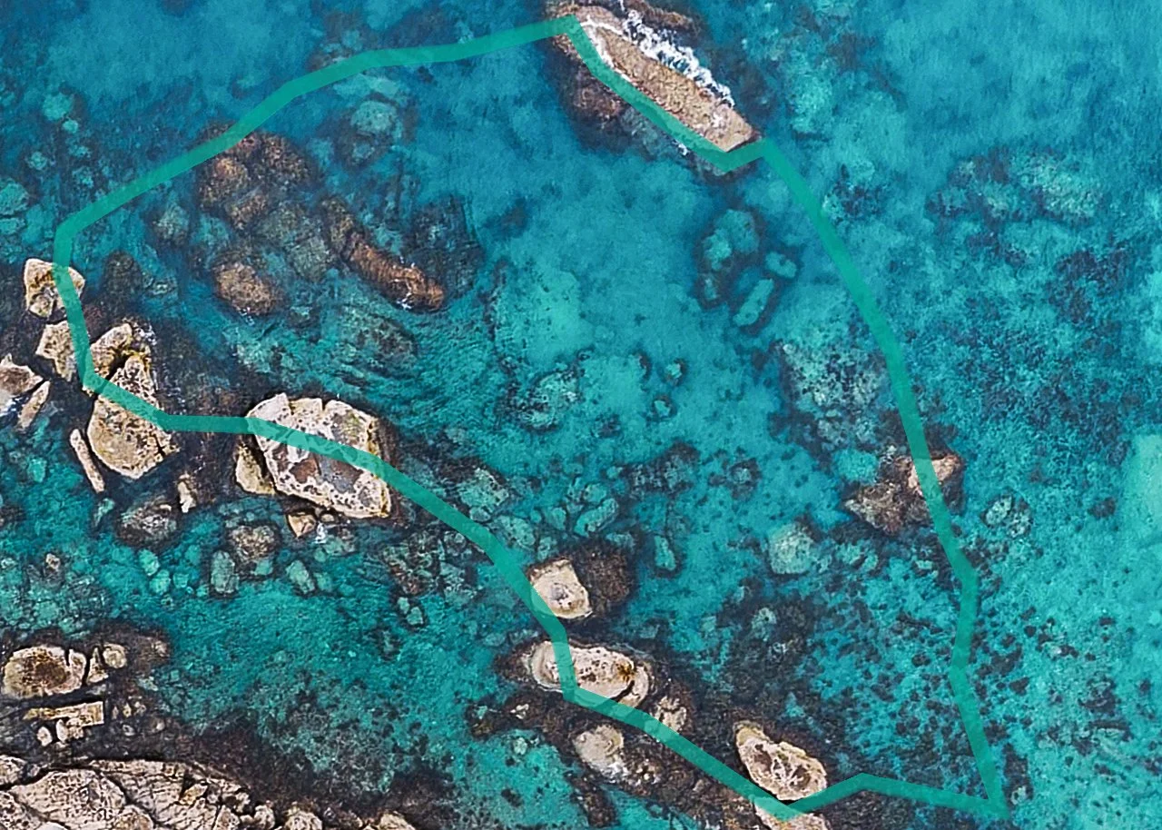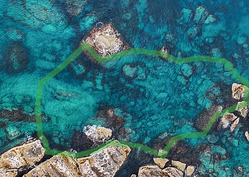 Comparisons between the aerial imagery of the restoration site in 2023 and 2026 show a general increase in both kelp and mixed large brown seaweeds over time. Within the restoration site, a visible amount of mature kelp can be seen growing the top of the ‘inner channel’ or red zone (nicknamed ‘the fish bowl’ due to the increase in fish observed), which joins with the fringing kelp and mixed seaweed along the boundary of the blue and green zones. Deeper within the middle of the green zone, kelp can be observed growing around the boulders along the seafloor, developing between the edges of the boundary. In the blue zone, fringing kelp appears to have increased around the large, intertidal rocks that sit adjacent to the main reef (or island), and new, maturing kelp can be seen sporadically in between. In the bottom right corner of the aqua zone, both dense and sparse kelp regrowth can be observed, which also crosses outside of the boundary and the restoration site.