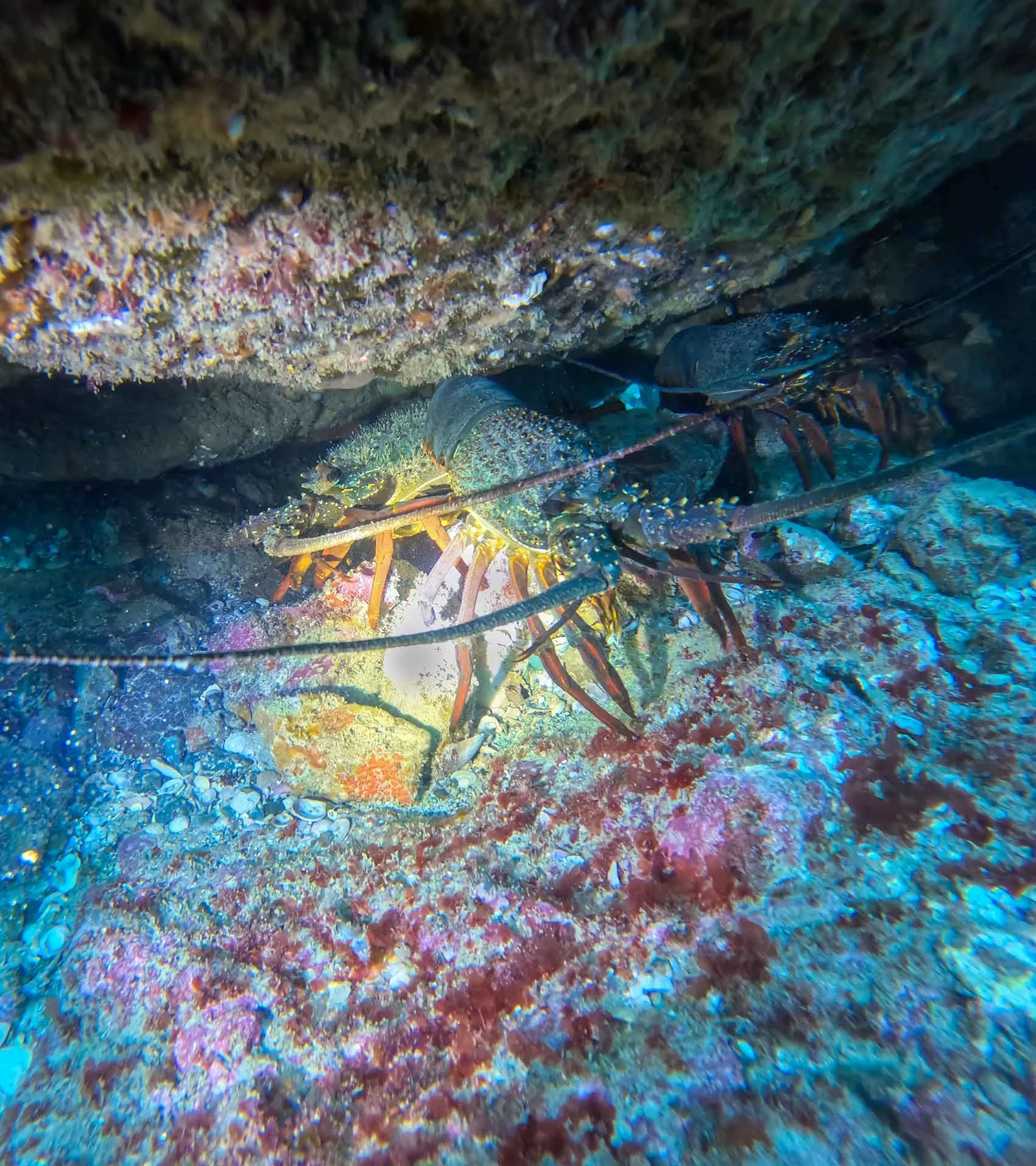 Packhorse lobsters (pawharu, Sagmariasus verreauxi) living together on the rocky reef.