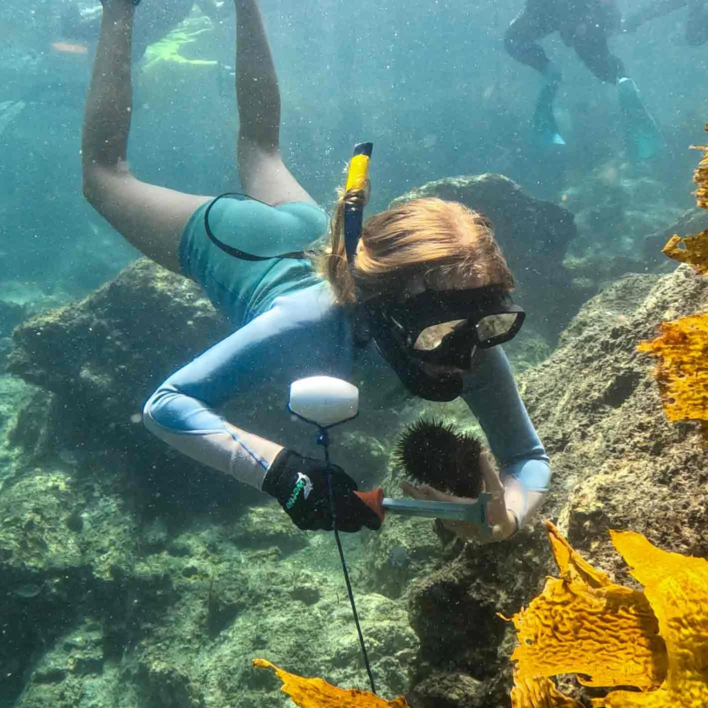 A rewilding volunteer harvests kina to support kelp regrowth